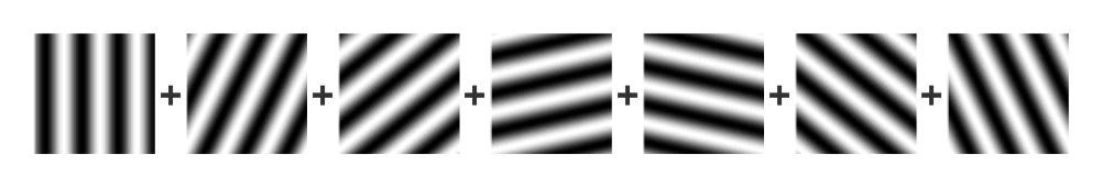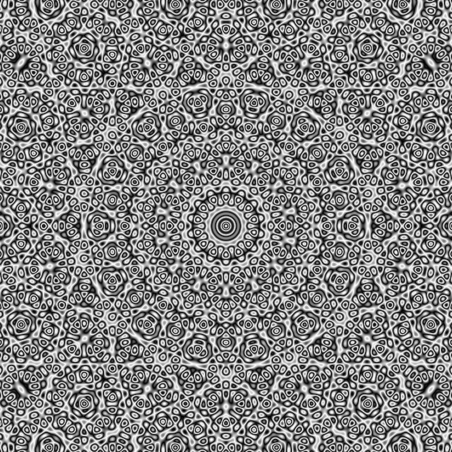 Seguendo un'idea di Keegan McAllister si può fare una media di più onde sinusoidali con inclinazioni diverse per ottenere pattern che ricordano quelli dei quasicristalli: