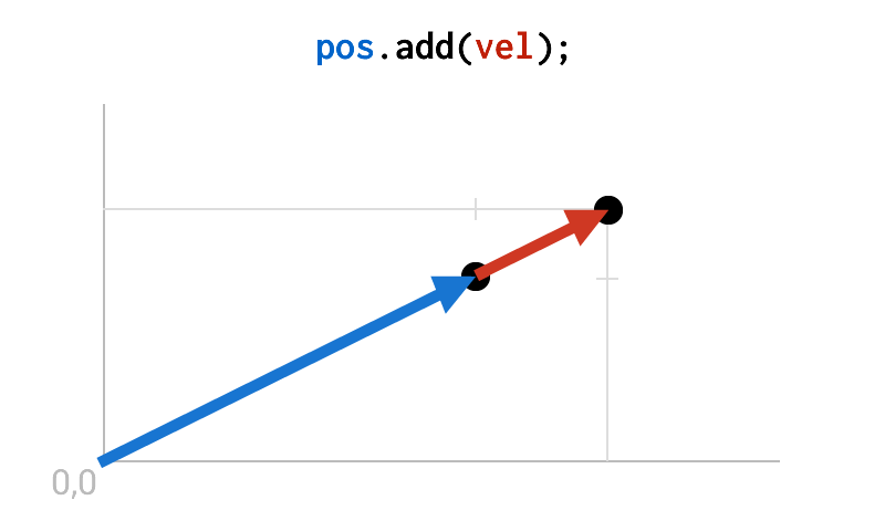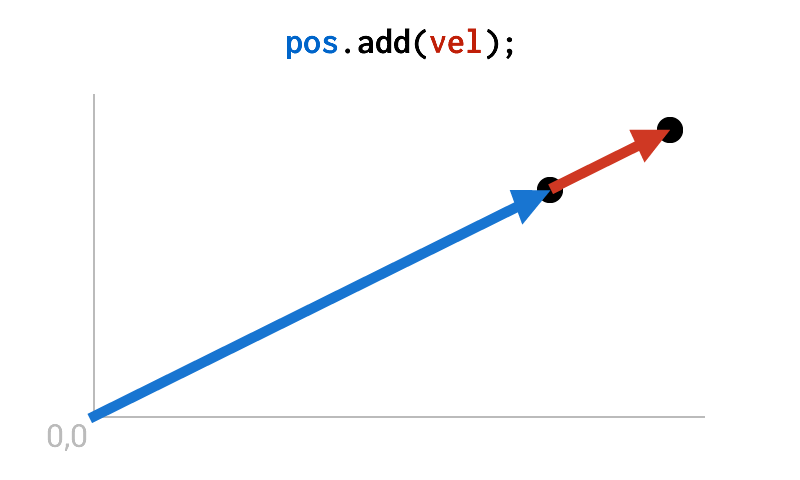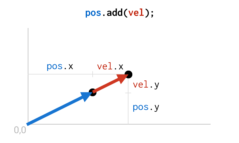 Attraverso il metodo add() è possibile sommare a un vettore (ad es. pos) un altro vettore (ad es. vel) che ne aggiorni le coordinate (pos.x, pos.y) in modo da ottenere uno spostamento.